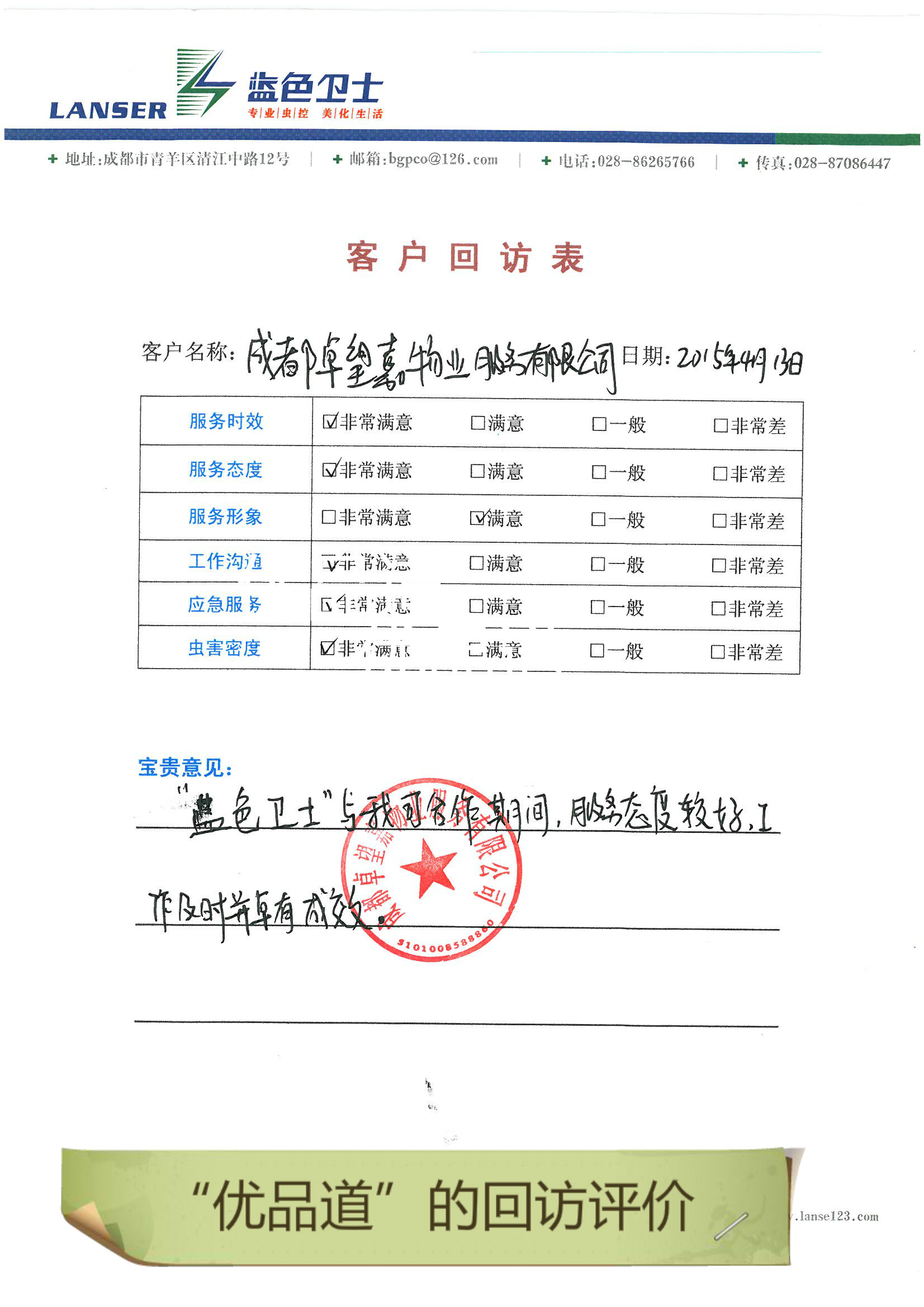 通過合作,對四害的消殺控制的很好,符合項目品質要求!